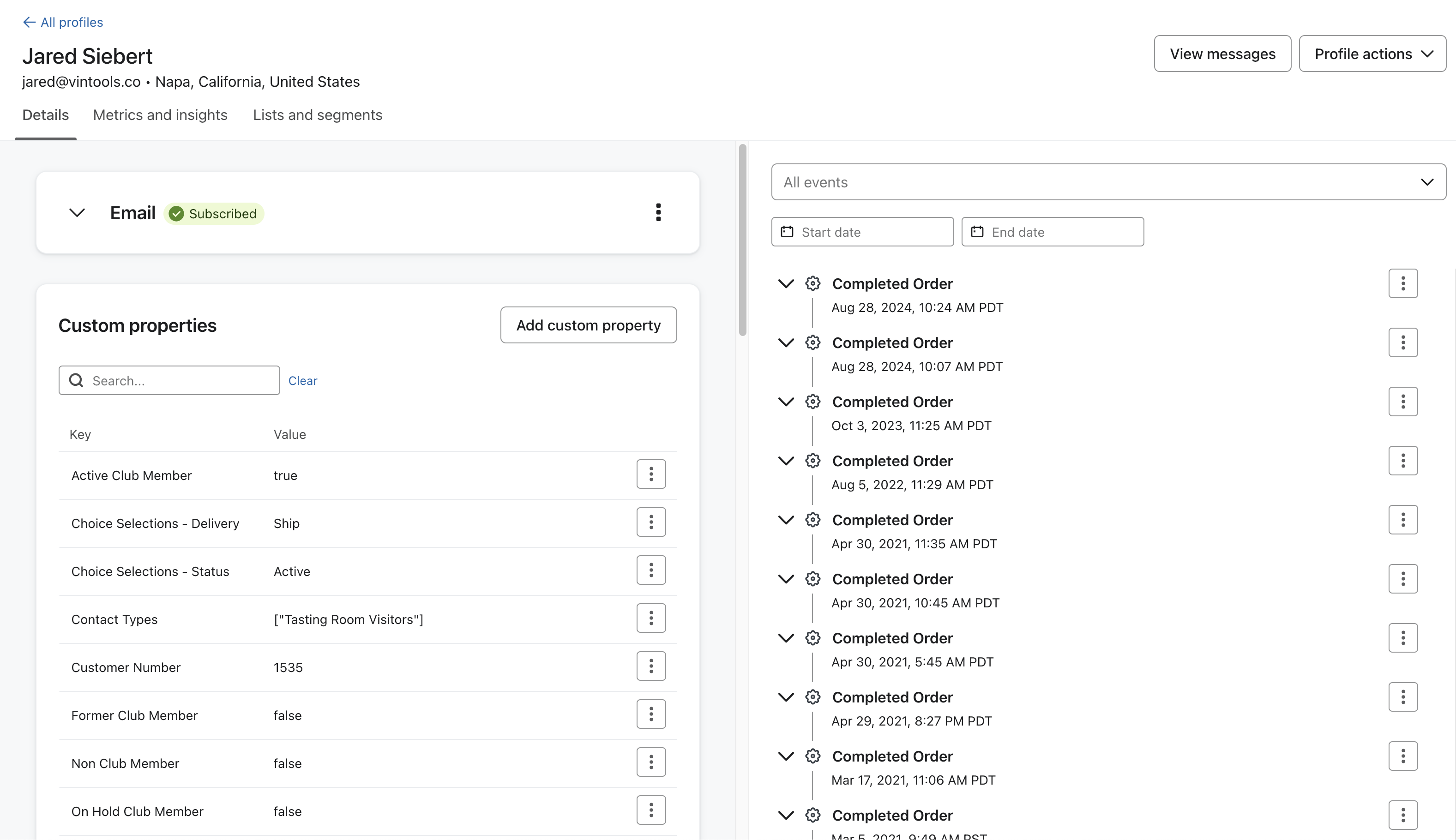 Products & Purchase History: Know exactly what your customers are craving—from a bottle of your best vintage to the latest tasting event. Tailor your offers and recommendations to suit their tastes, driving more purchases and engagement.